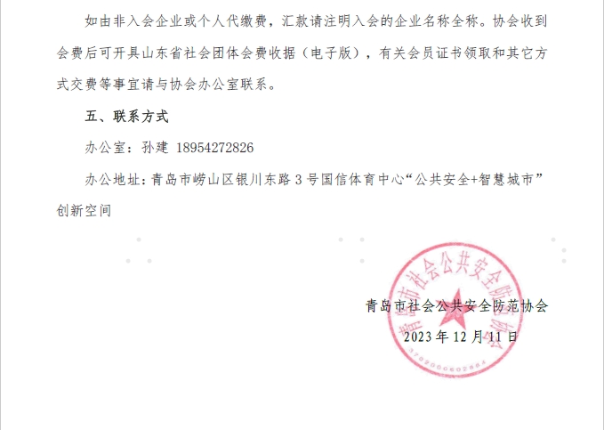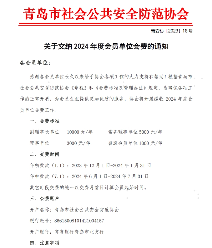 感謝各單位長久以來給予協(xié)會各項工作的大力支持和幫助!根據(jù)青島市社會公共安全防范協(xié)會《章程》和《會費標準及管理辦法》規(guī)定,為確保各項工作的正常開展,為會員企業(yè)提供更加優(yōu)質的服務,協(xié)會將開展繳收2024年度會員單位會費工作。